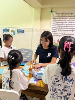 Following the themes of first week sessions in our past initiatives, we focused in introductory activities that taught self-introductory phrases like "my name is.." "what's your name?" with DIY name placards.
